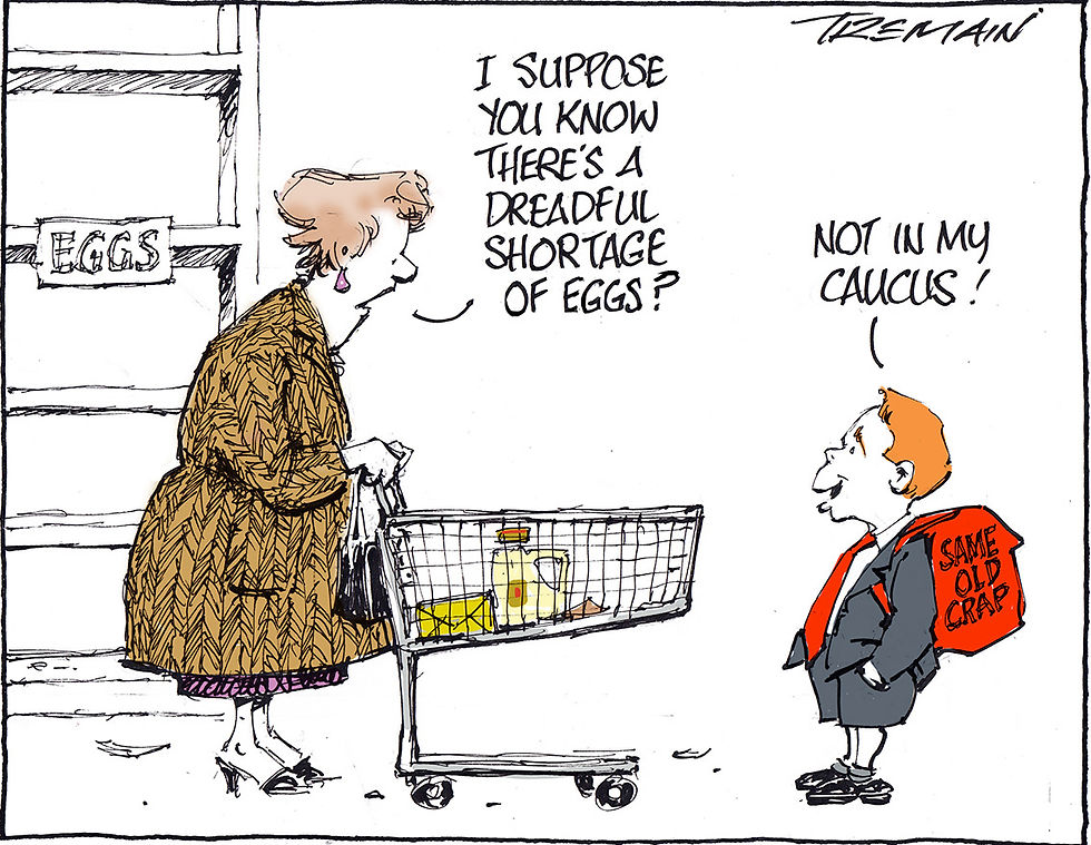 I suspect the "eggs" in that Caucus came in pretty much "scrambled" at the start, marxist ideology will do that to you. Yeah and a couple are already showing signs of being "overdone" and completely "fried". Certainly the financial and education portfolios are completely "addled". No "sunny side up" there.